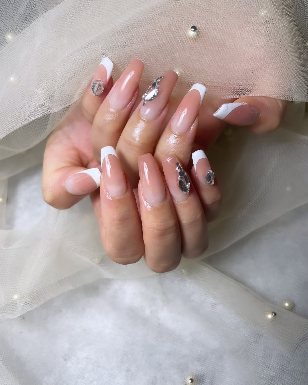 埋め込みビジューがアクセントになったキラキラネイル