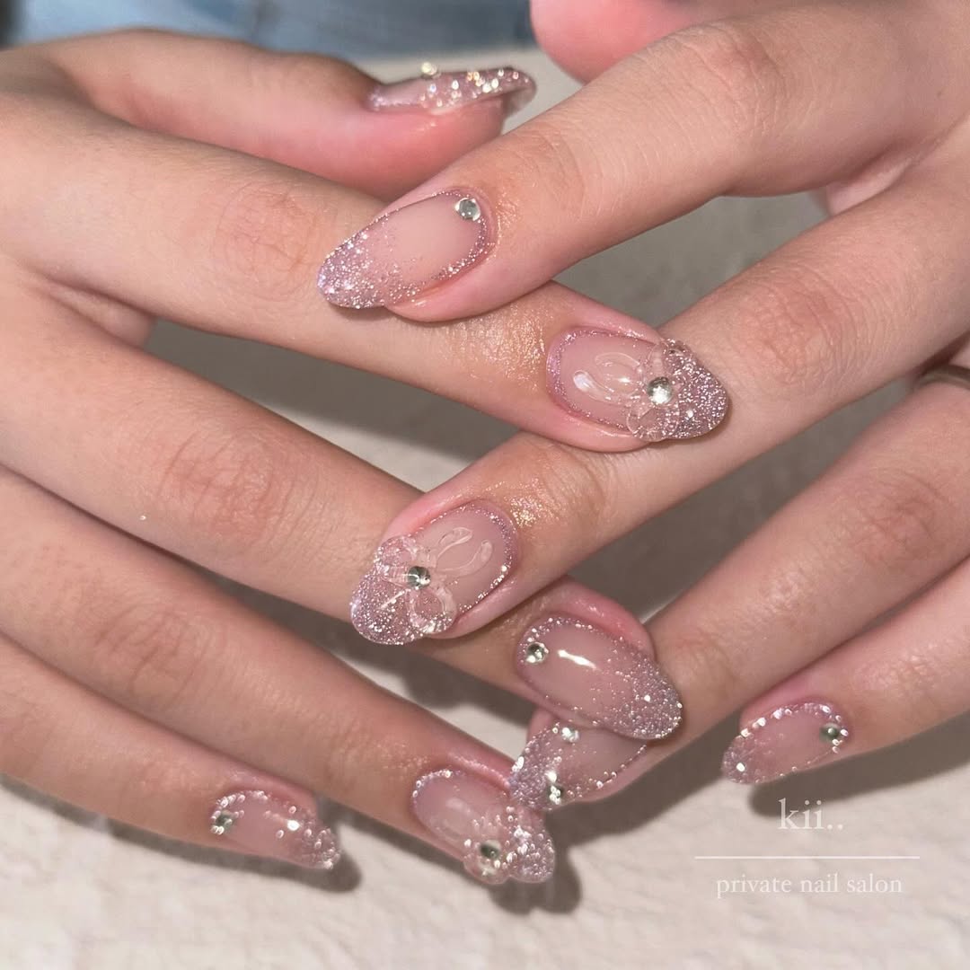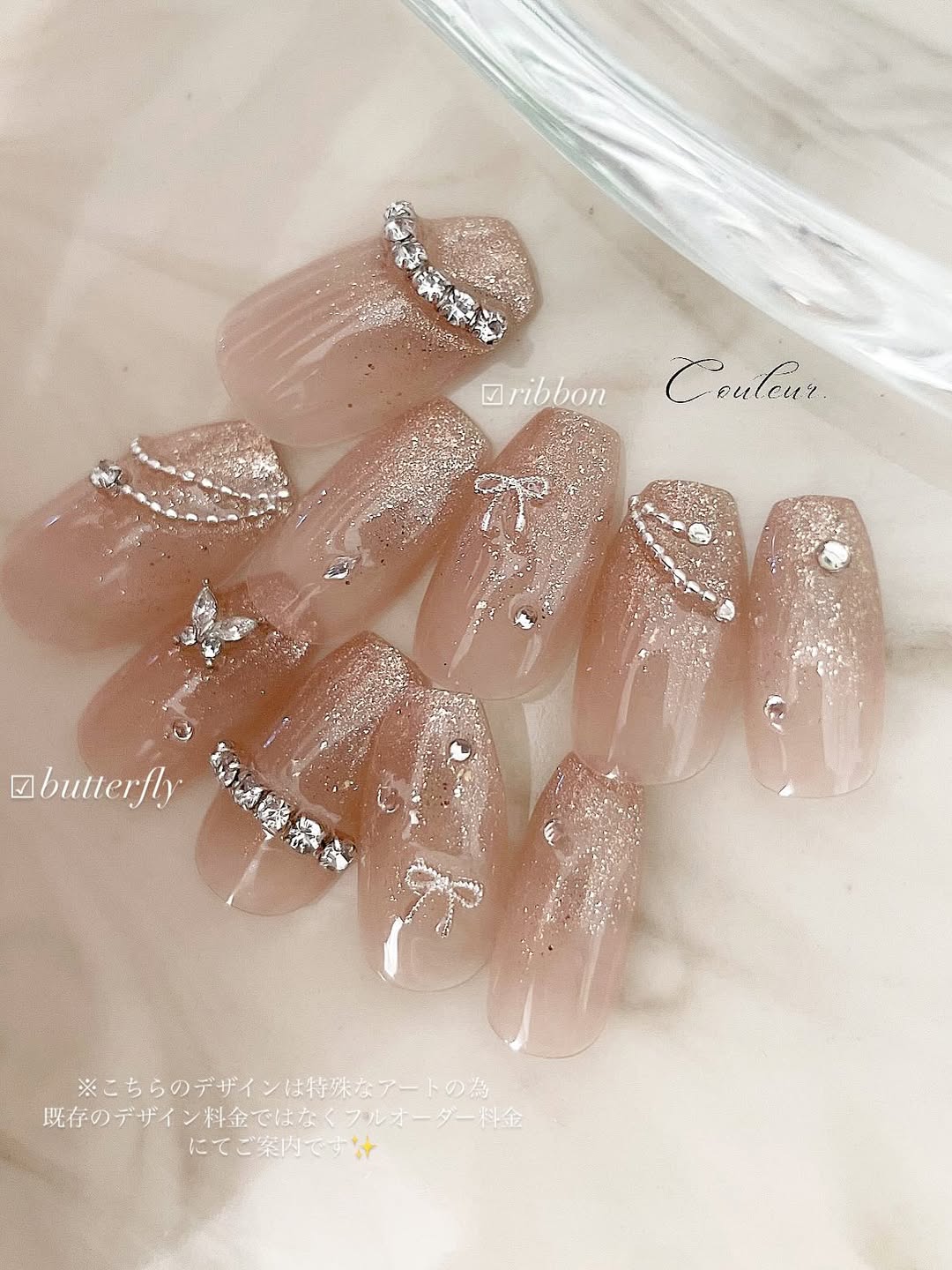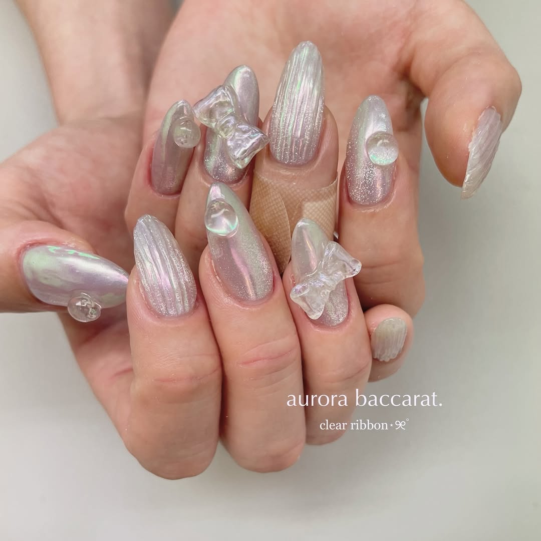 こちらはクリアベースにオーロラパウダーをかけたアレンジで、透明感のある仕上がり。角度によって色味が変わるオーロラの幻想的な美しさが目を引くキラキラネイルです。大きめのリボンが目を引きますが、クリアな質感で作られているため甘くなりすぎません。トレンドのバカラネイル(グラスのような縦模様が入ったデザイン)が取り入れられているところも注目ポイントです。