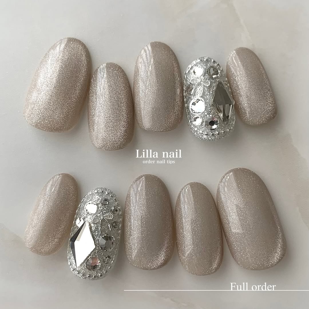 グレージュ系のマグネットアートに、キラキラのビジューがポイントとして取り入れられたネイルデザイン。グレージュ系のカラーはおしゃれで落ち着いた色味なので、大人の女性やオフィスネイルとしてもおすすめです。ビジューはポイント使いとして取り入れられているので派手になりすぎず、程よい華やかさのキラキラネイルが楽しめます。