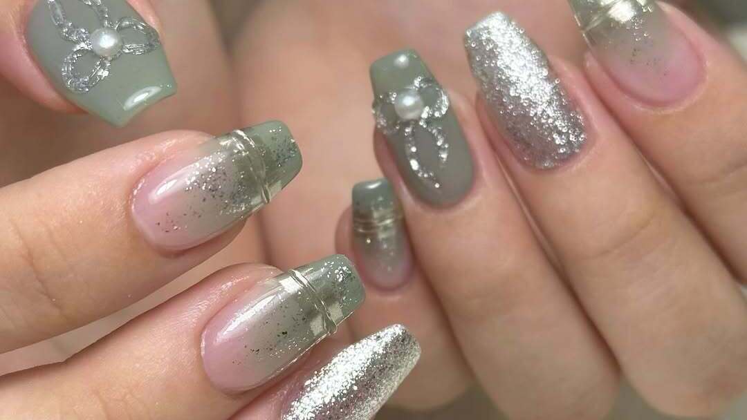 こちらはクリアベースにオーロラパウダーをかけたアレンジで、透明感のある仕上がり。角度によって色味が変わるオーロラの幻想的な美しさが目を引くキラキラネイルです。大きめのリボンが目を引きますが、クリアな質感で作られているため甘くなりすぎません。トレンドのバカラネイル(グラスのような縦模様が入ったデザイン)が取り入れられているところも注目ポイントです。