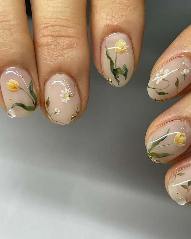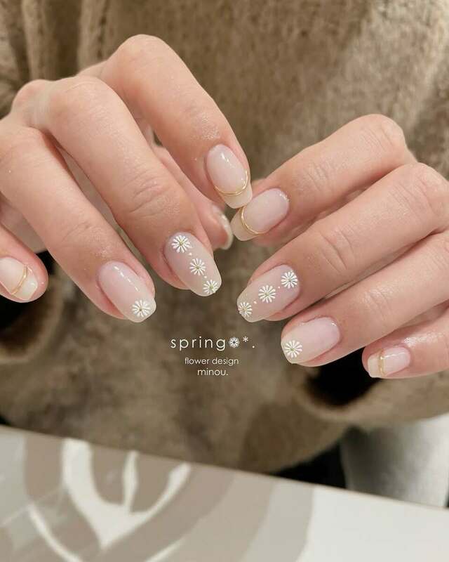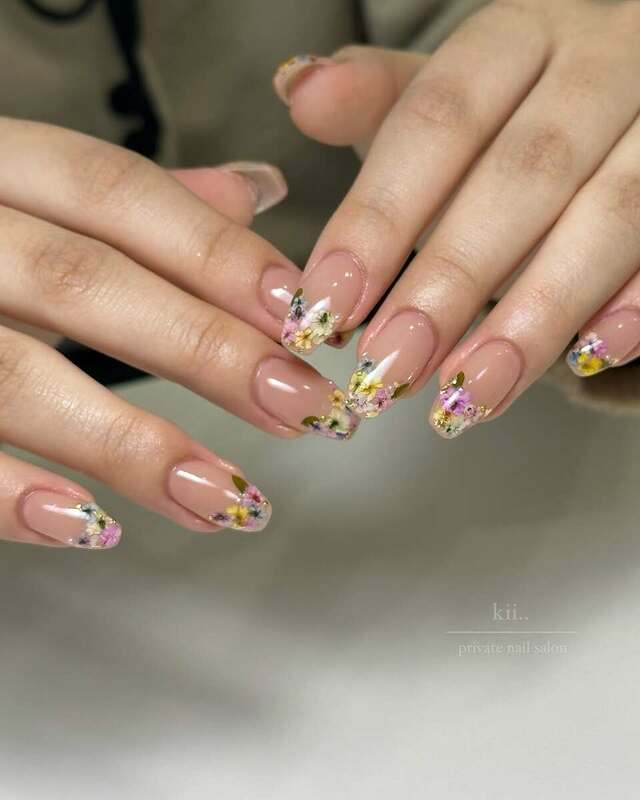 ヌーディーなベースカラーと合わせると、カラフルなお花も大人っぽくまとまります。シンプルな雰囲気のネイルがお好きな方は、ぜひ参考にしてみてくださいね。