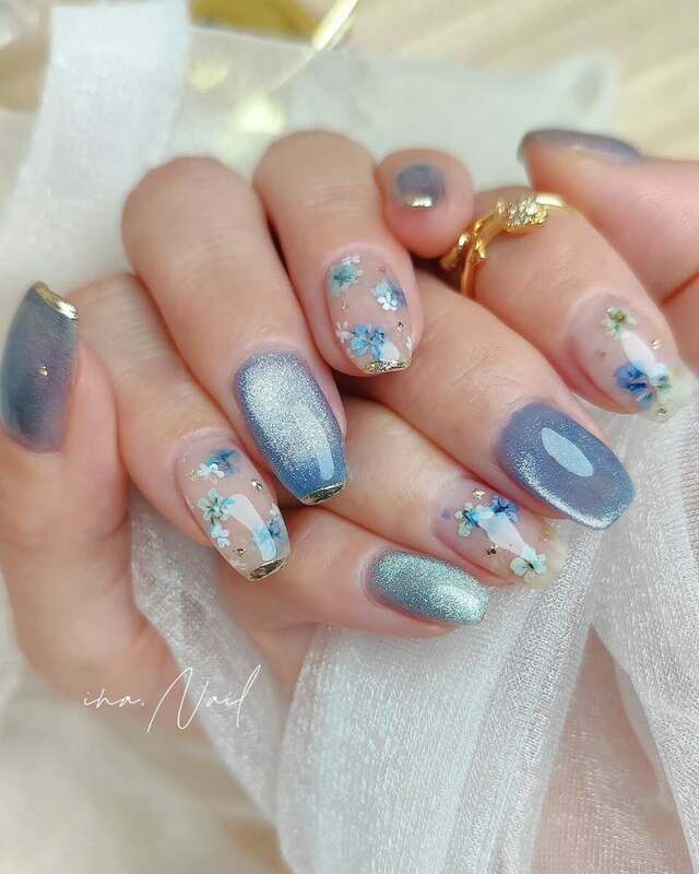 ブルー系カラーでまとめたお花ネイルです。このデザインには、押し花だけでなく手描きのお花も描き加えられています。水色やブルーグリーンの小花が散りばめられ、とてもおしゃれですね。