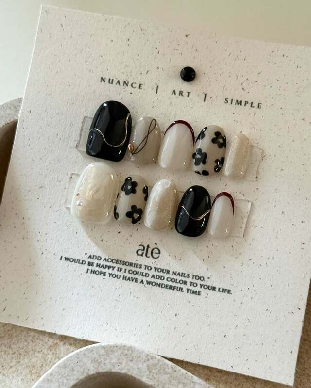 モノトーンカラーでまとめた、大人っぽいお花ネイルです。マリメッコ風のお花模様が印象的ですね。お花アート以外の部分にも工夫が凝らされていて、ニュアンス感たっぷりの極細ラインや、あえてハケ跡を残して塗ったニュアンスアートなど、見どころがたっぷり。「指先まで洗練された印象に整えたい」というおしゃれさんにぴったりのネイルデザインです。