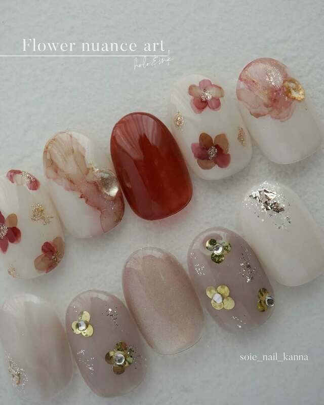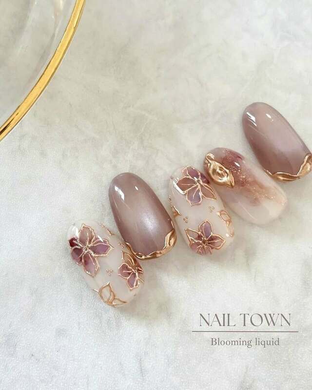 ピンクブラウン系のカラーがかわいい、儚げな印象のお花ネイルです。インクならではのにじんだようなカラーを、ゴールドで縁取ることでくっきりとさせています。「インクでお花を描くと、ぼやけて何が何だか分からなくなる…」という方におすすめのデザインです。