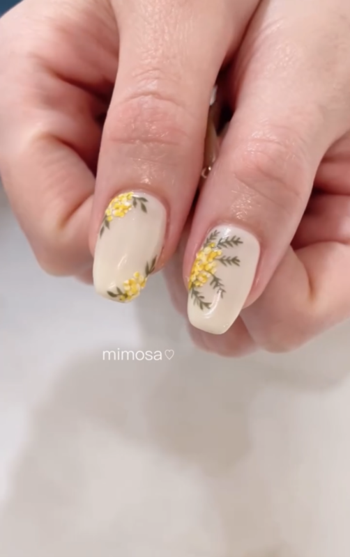 ミモザの黄色が春に映えるトレンド感たっぷりのお花ネイル