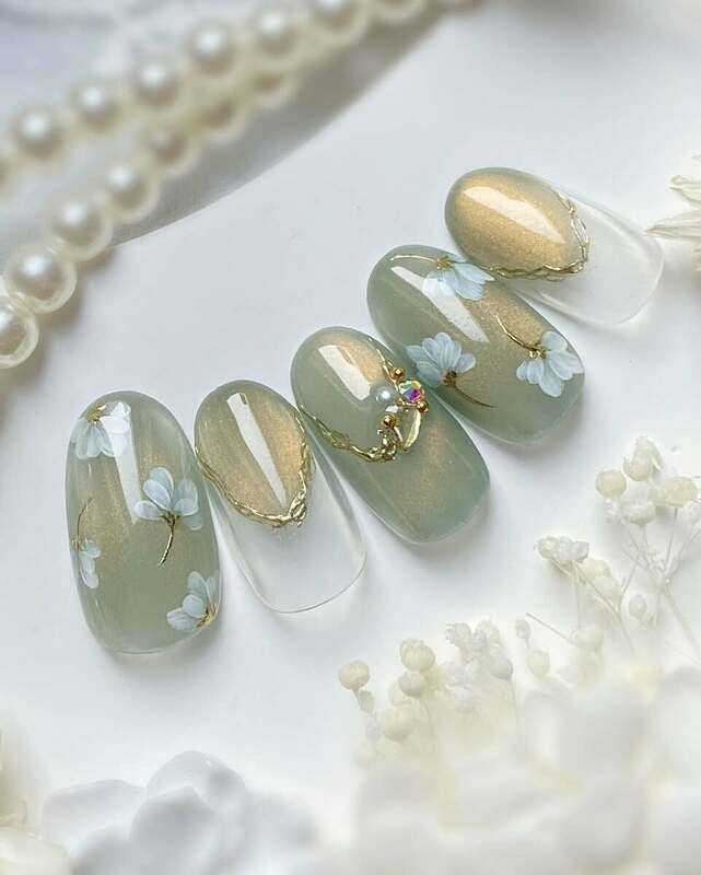 くすみグリーンをベースにしたお花ネイルです。ゴールドのような輝きを含んだグリーンが上品で素敵ですね。また、お花の正面ではなく横顔を描くことで、どこか抜け感のある仕上がりに。ホワイトで描かれた小花がさりげなく春らしさをプラスする、おしゃれな春ネイルとなっています。