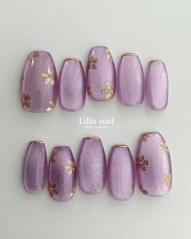 全体をパープルでまとめた、ミステリアスな雰囲気のお花ネイルです。シンプルなマグネットアートネイルのうえに、さりげなくミラーフラワーがあしらわれています。ゴールドに輝くお花アートが上品ですね。シンプルだけど個性的なお花ネイルをお探しの方や、和装に合うお花ネイルをお探しの方におすすめのデザインです。